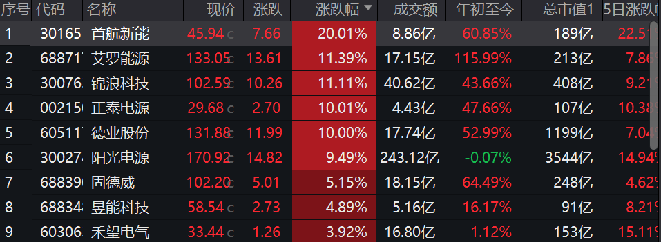 4)今日A股光伏逆变器和锂电暴涨,首航新能20cm涨停,艾罗能源、锦浪科技、正泰电源等涨超10%;天赐材料、海科新源等涨超8%。
