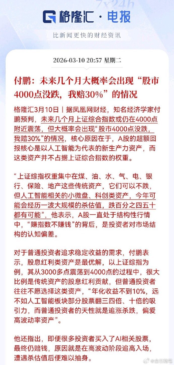5)近期付鹏言论刷屏,他预判:未来几个月上证综合指数或仍在4000点上下波动,但大概率会出现“股市4000点没跌,但我赔30%”的情况。
